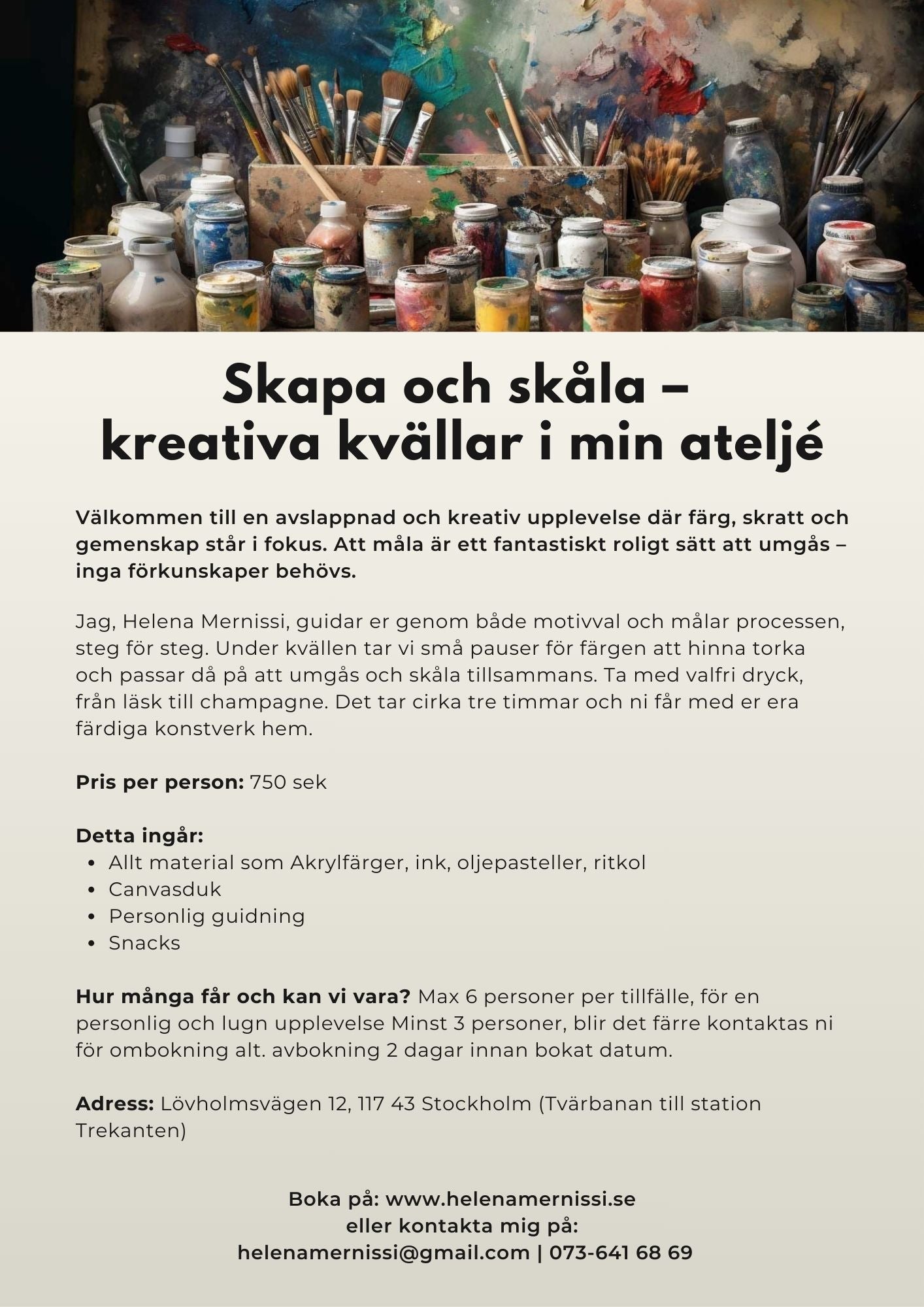Ser framemot att få dela mina erfarenheter inom mitt konstnärskap och visa glädjen att skapa något alldeles unikt själv att ta med hem