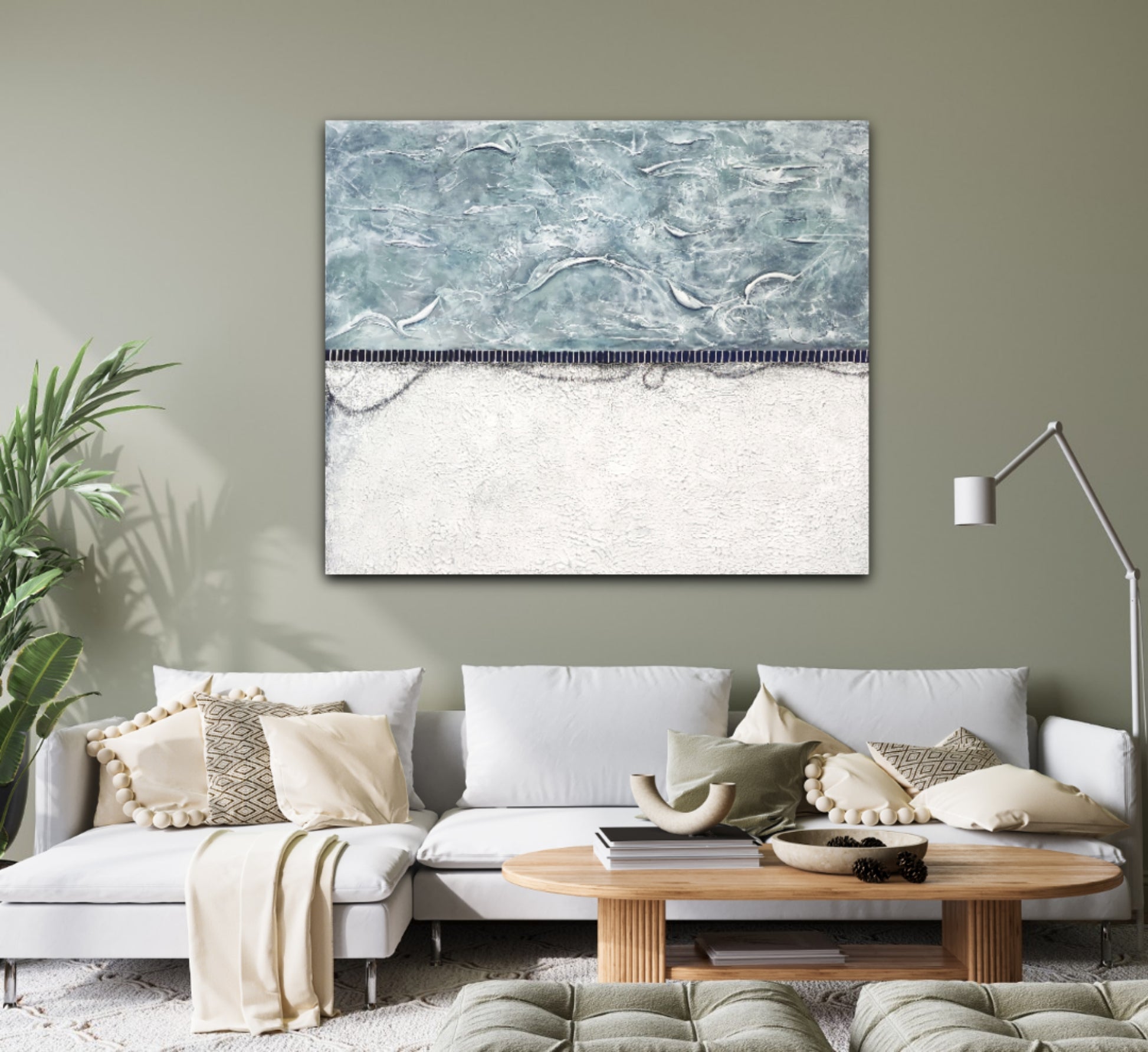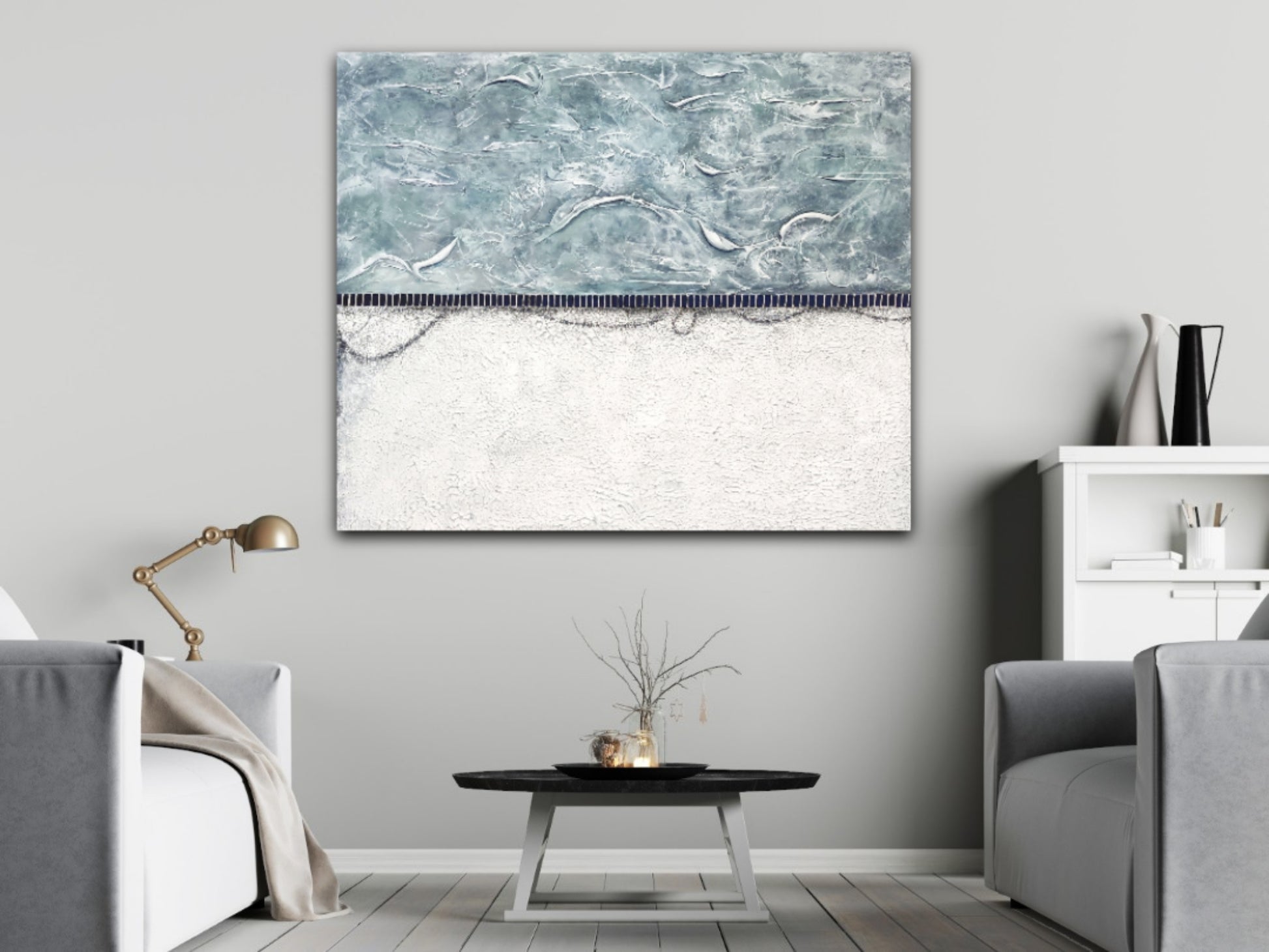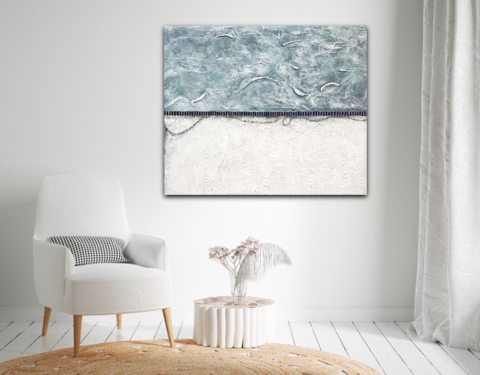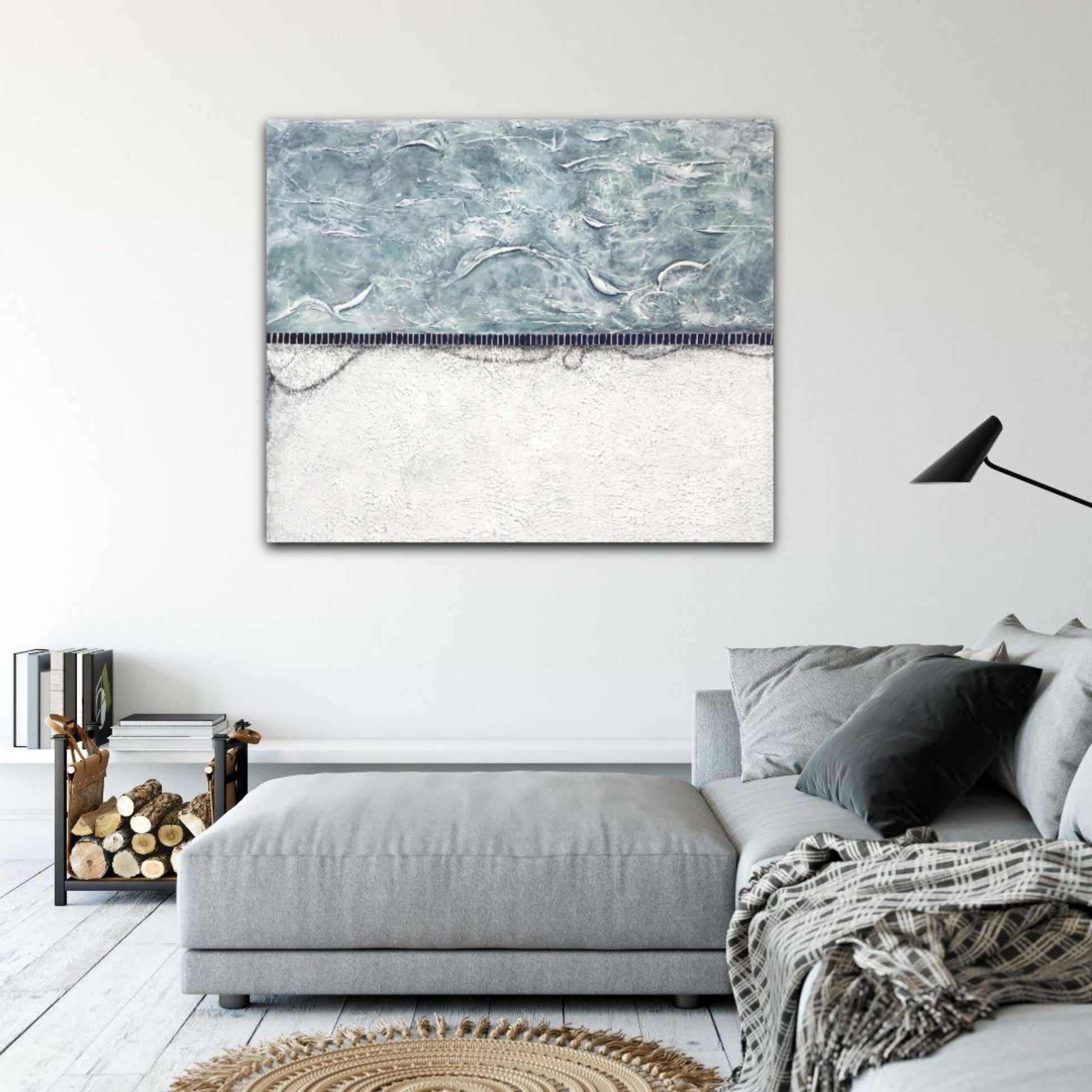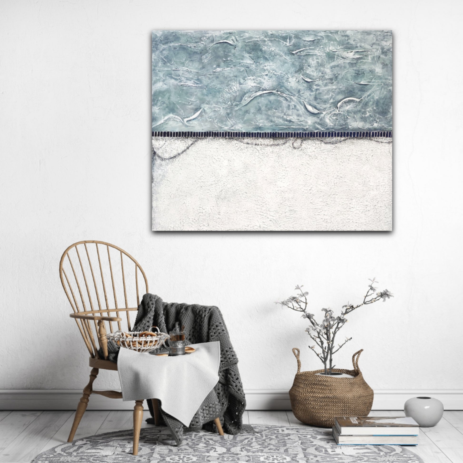 White/Grey/turquoise tones in textures over a more rustic white bottom