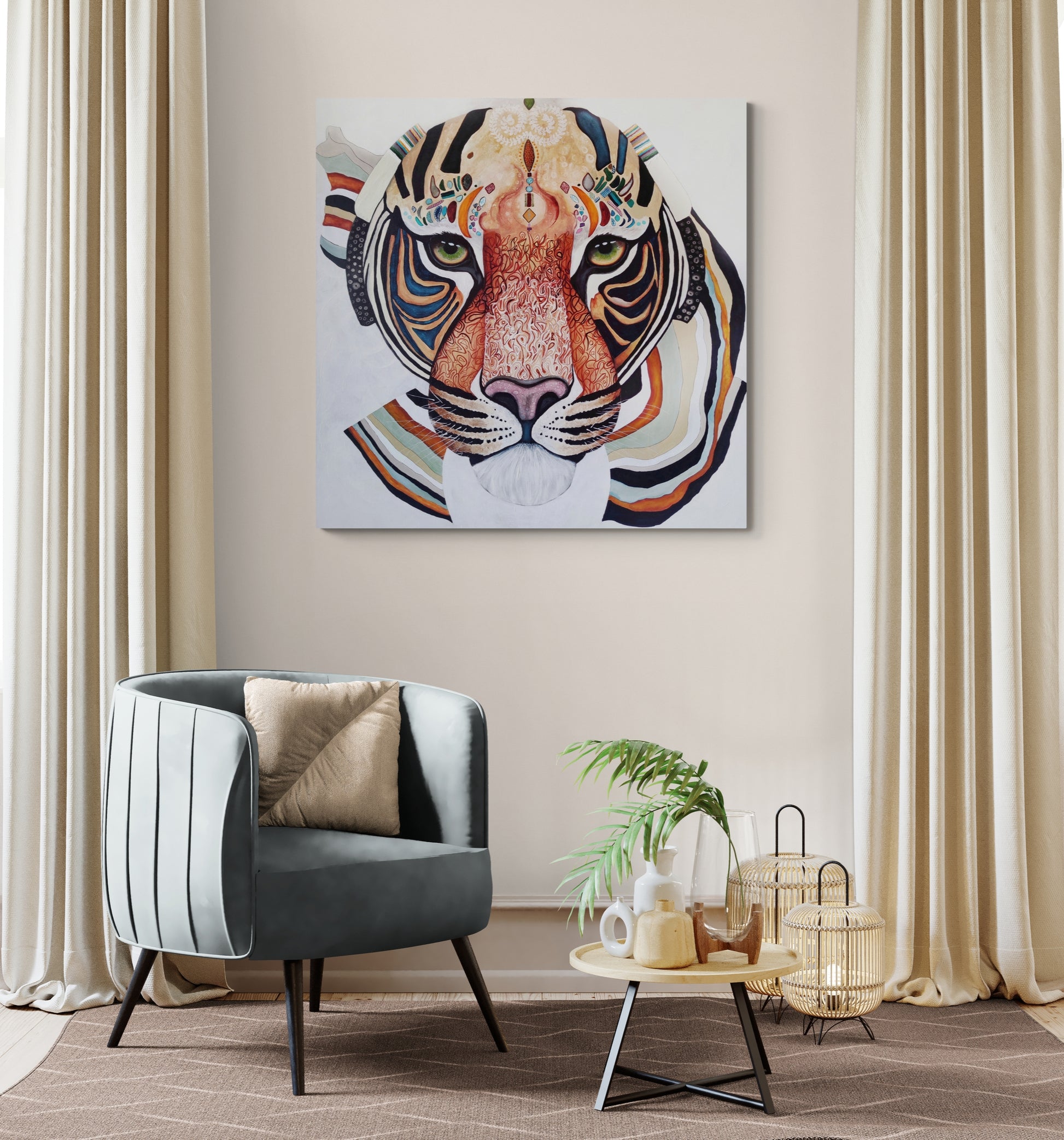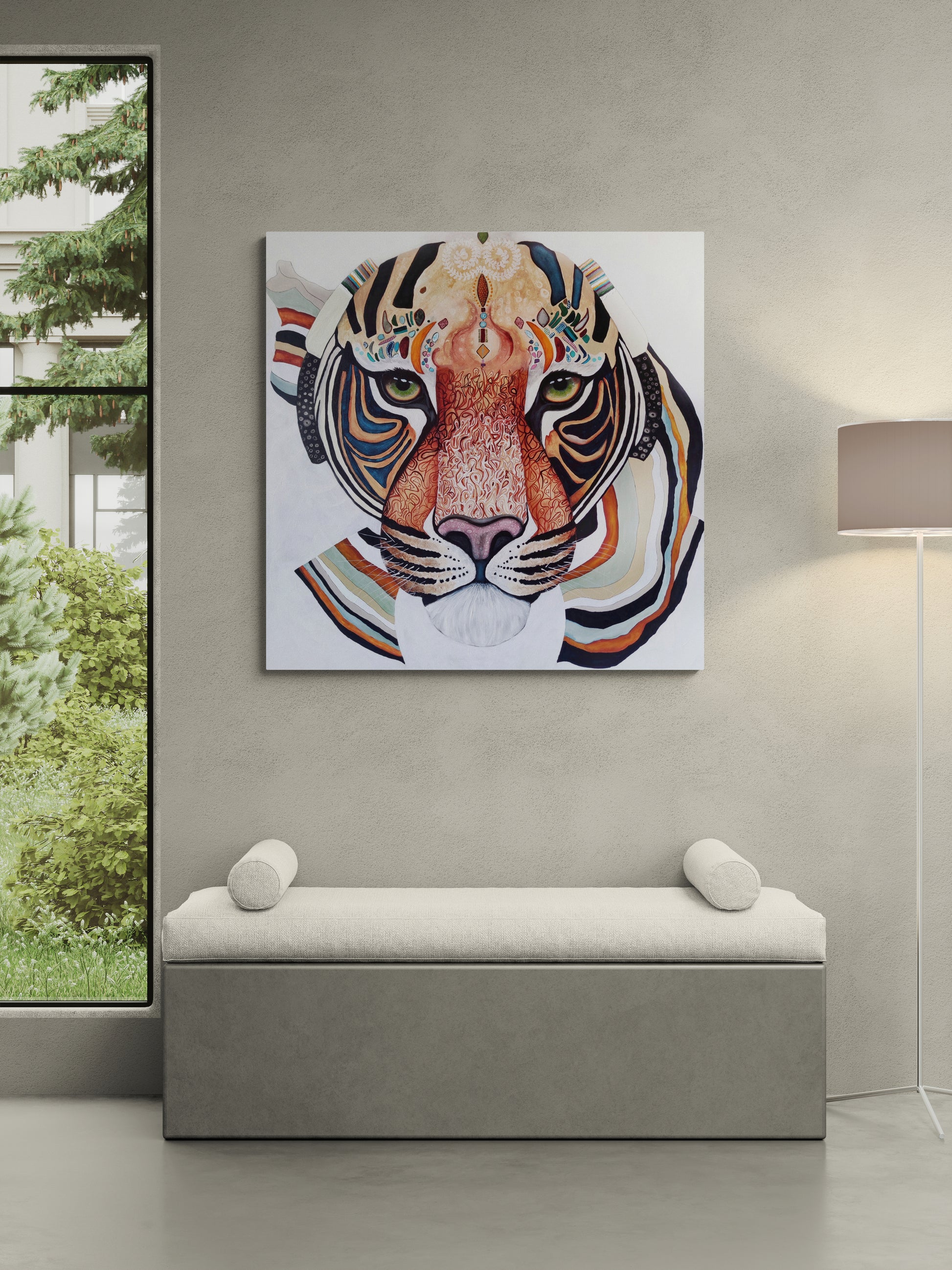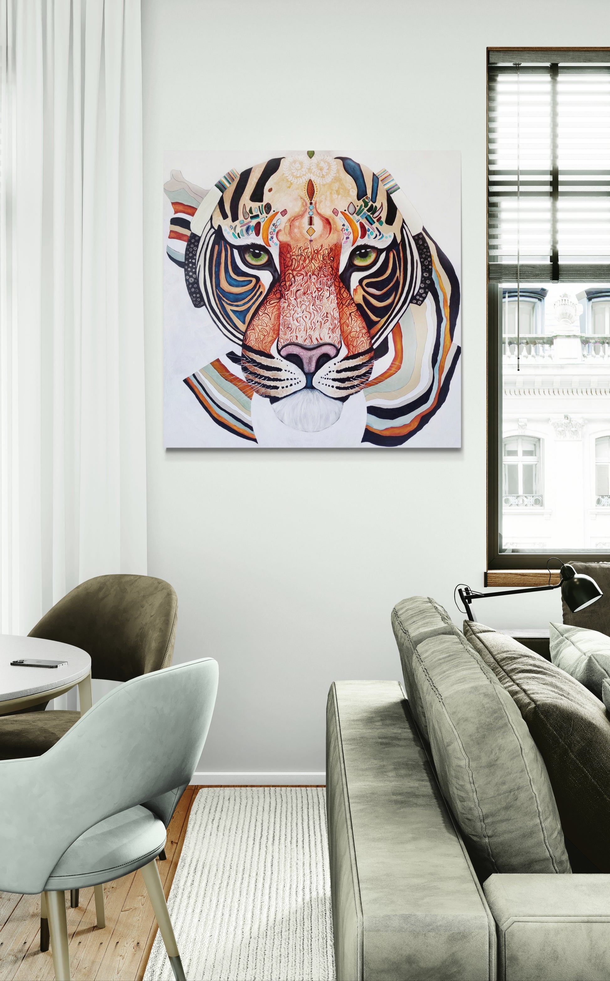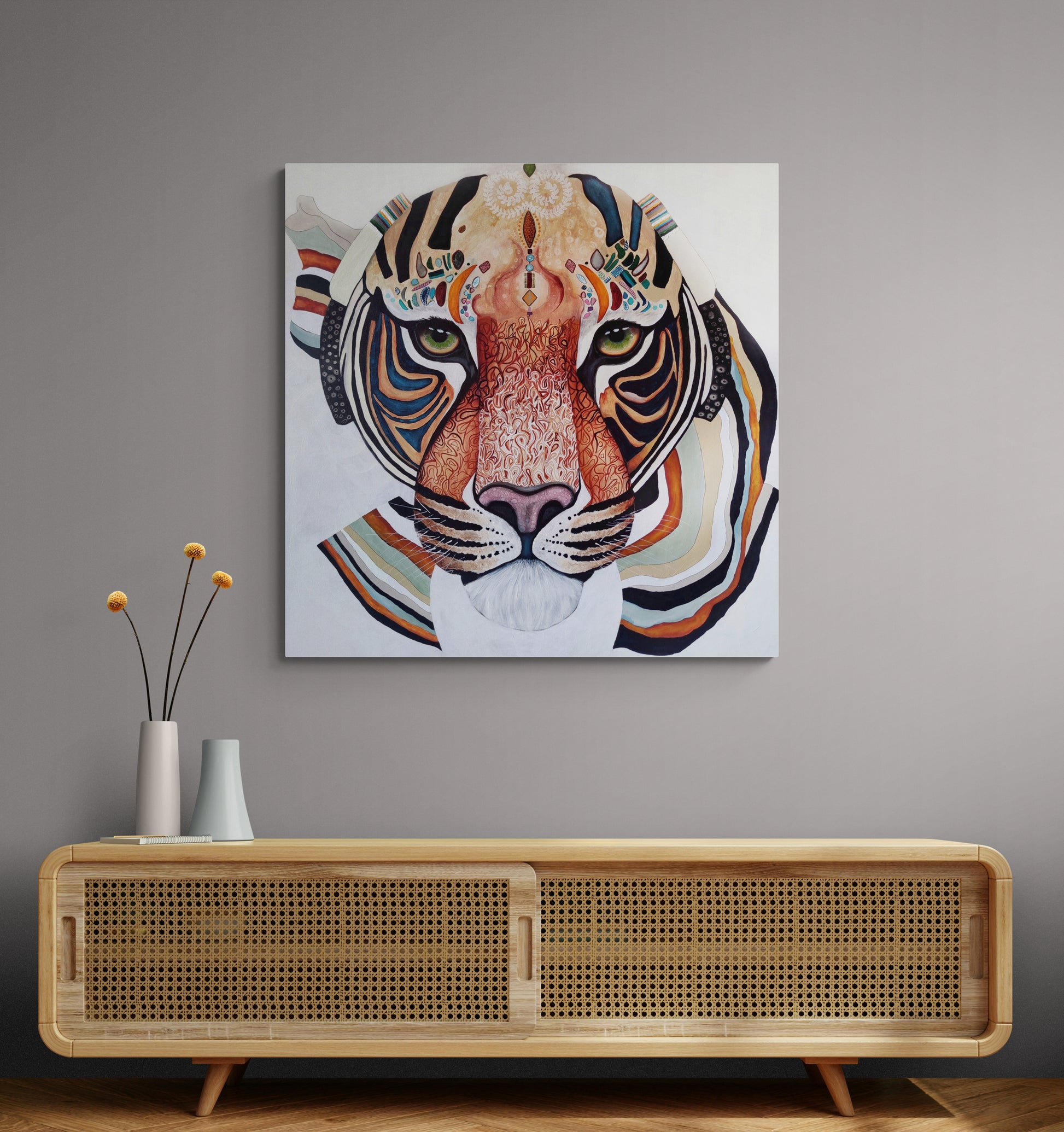 Detta konstverk känns som en hyllning till både styrka och stillhet – ett porträtt där jag försökt fånga tigerns själ som blir till ett helt universum av färger och mönster