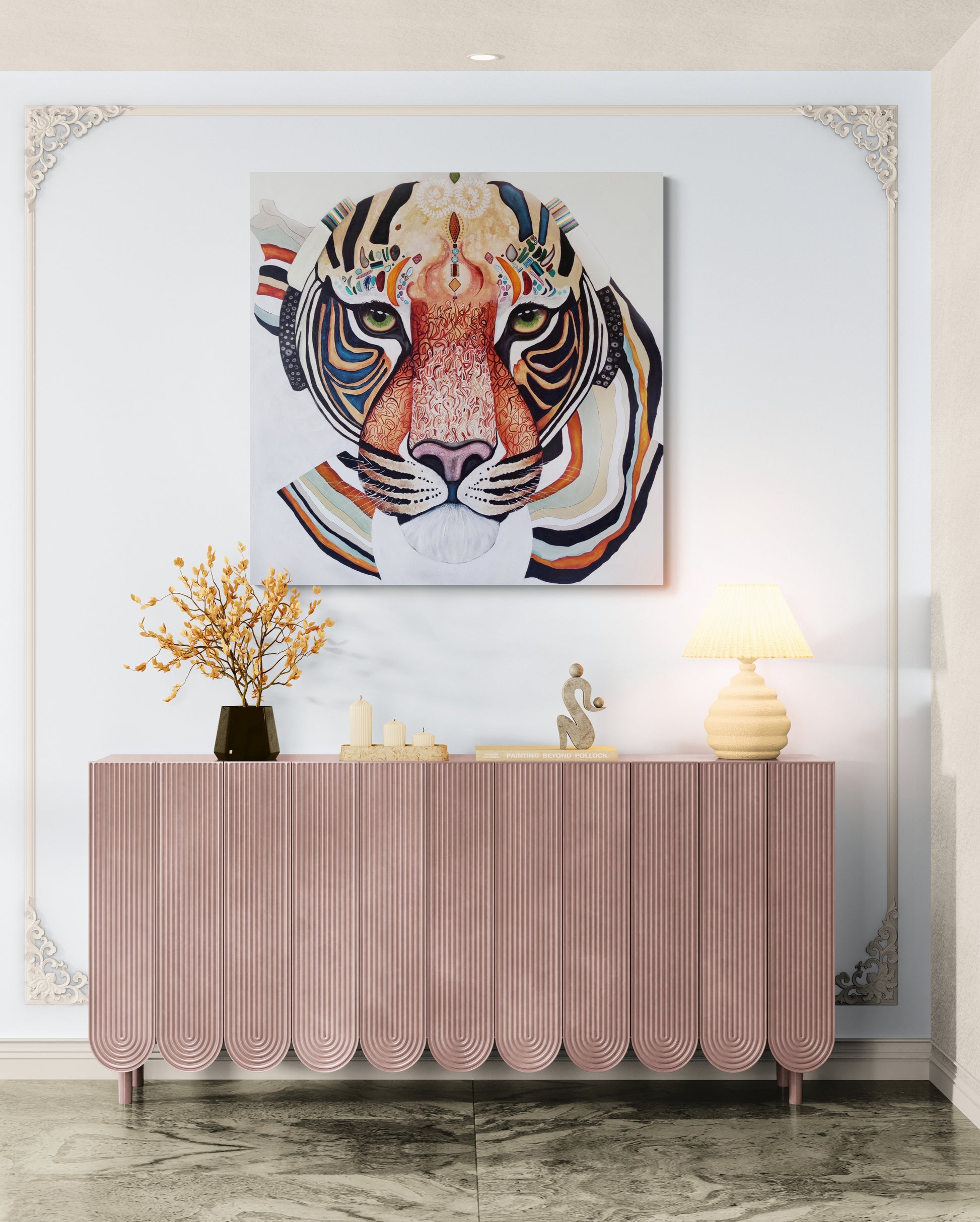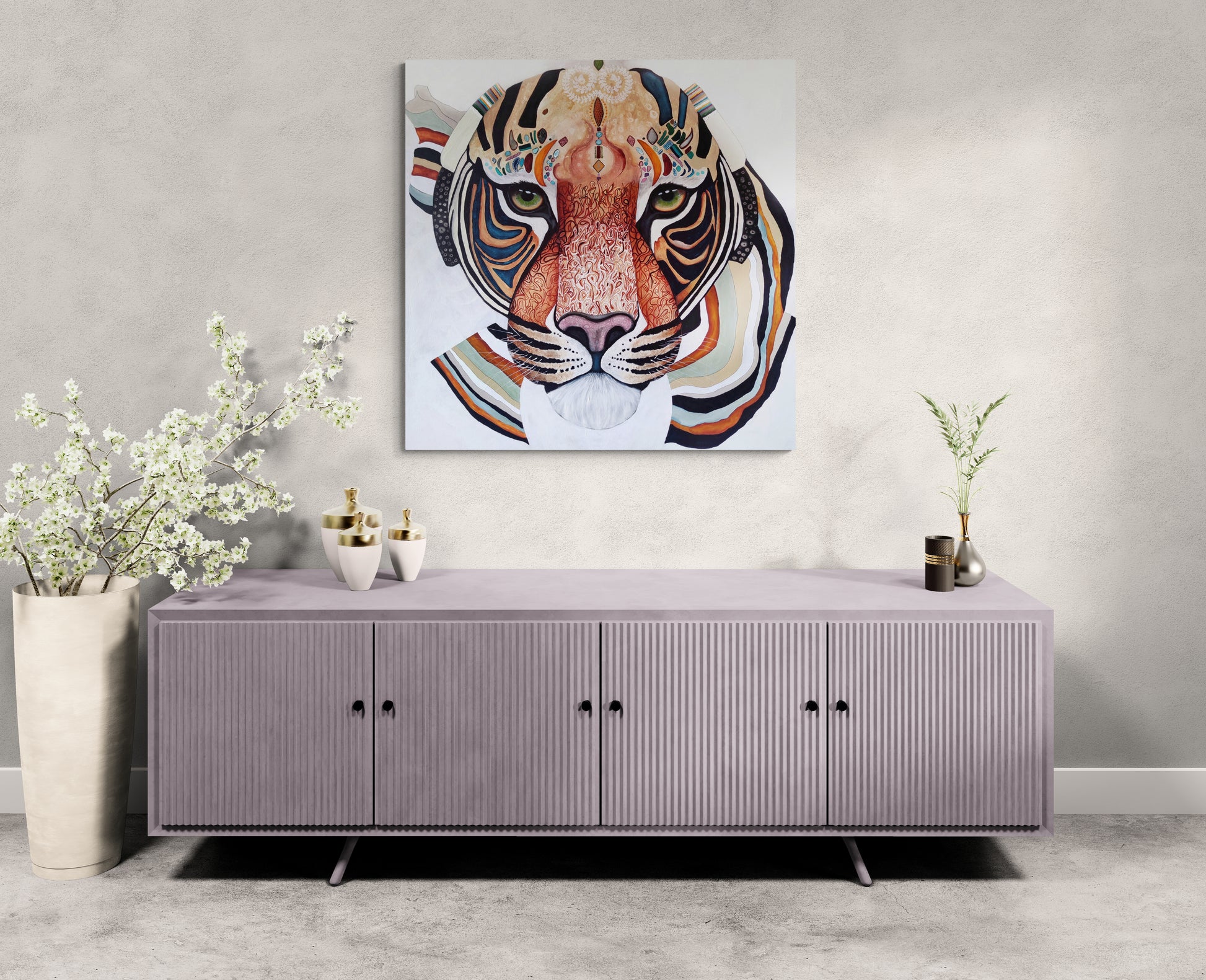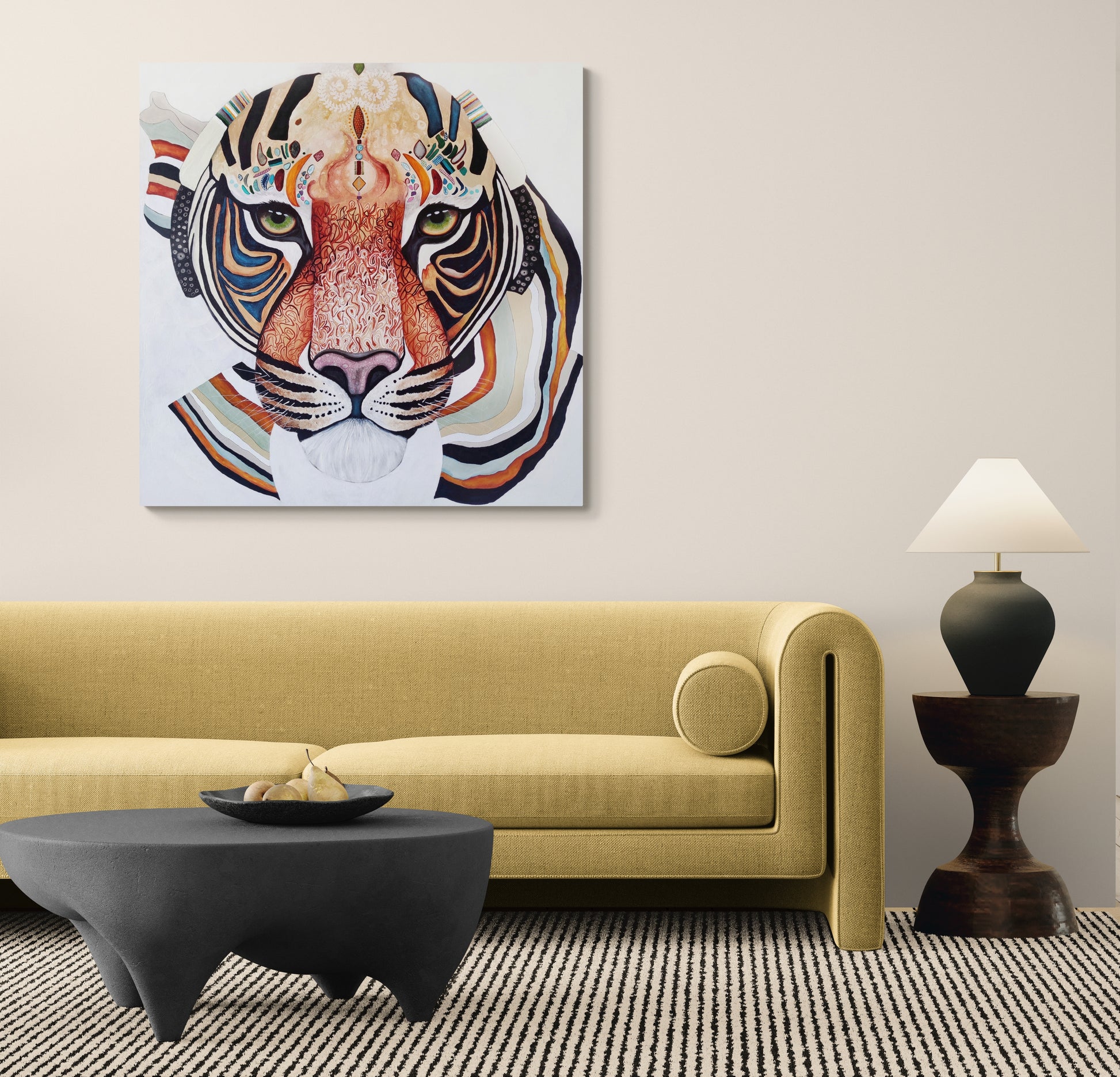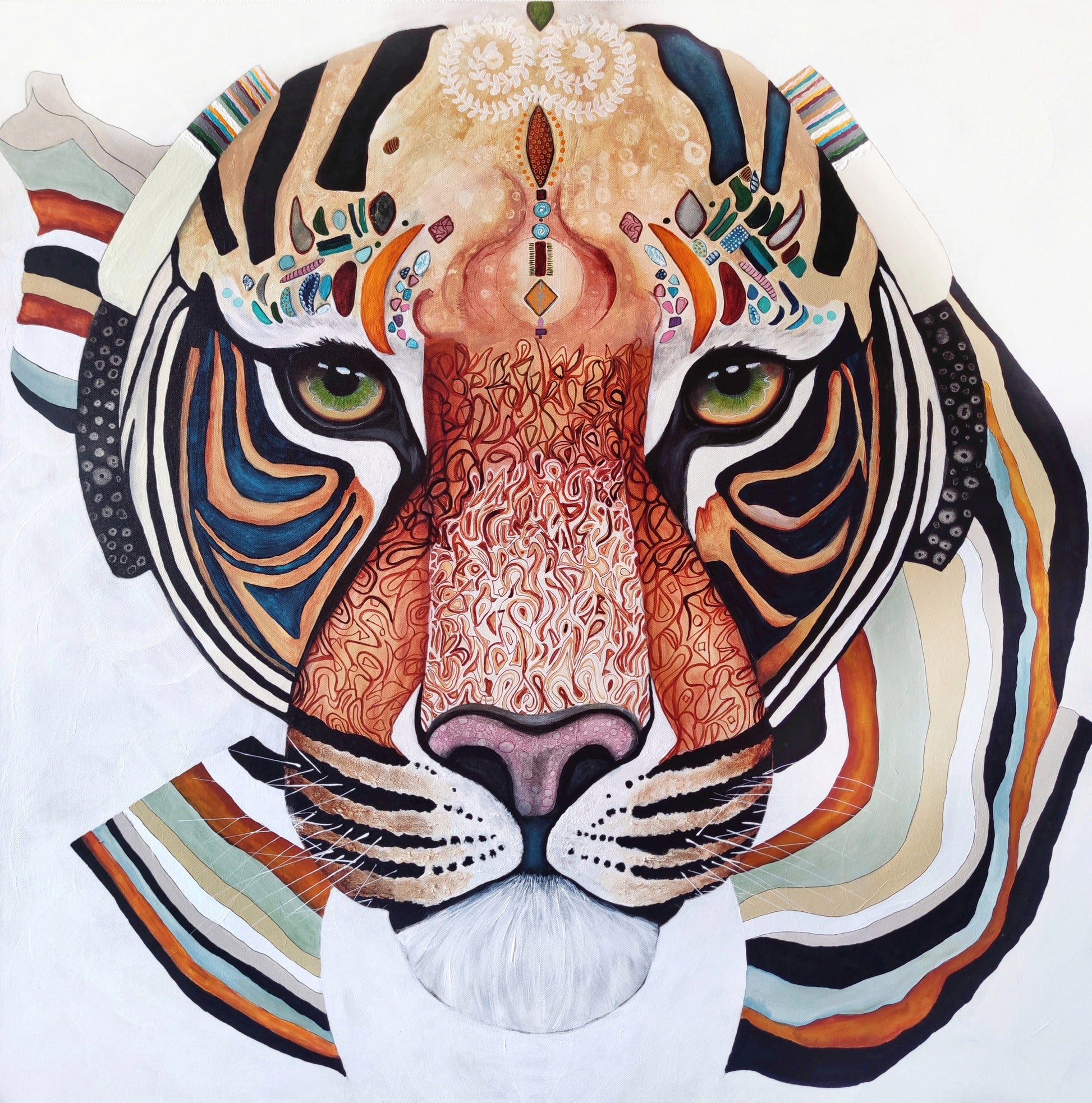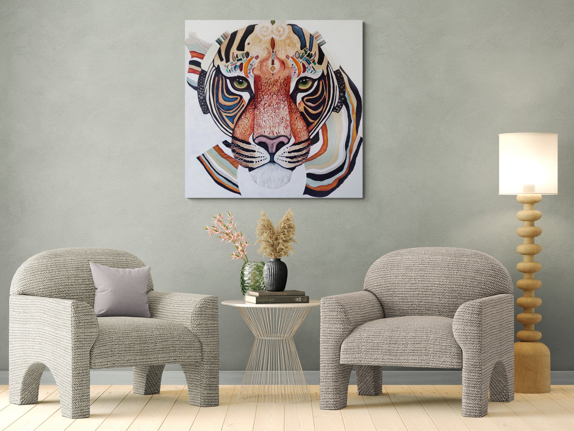 Detta konstverk känns som en hyllning till både styrka och stillhet – ett porträtt där jag försökt fånga tigerns själ som blir till ett helt universum av färger och mönster